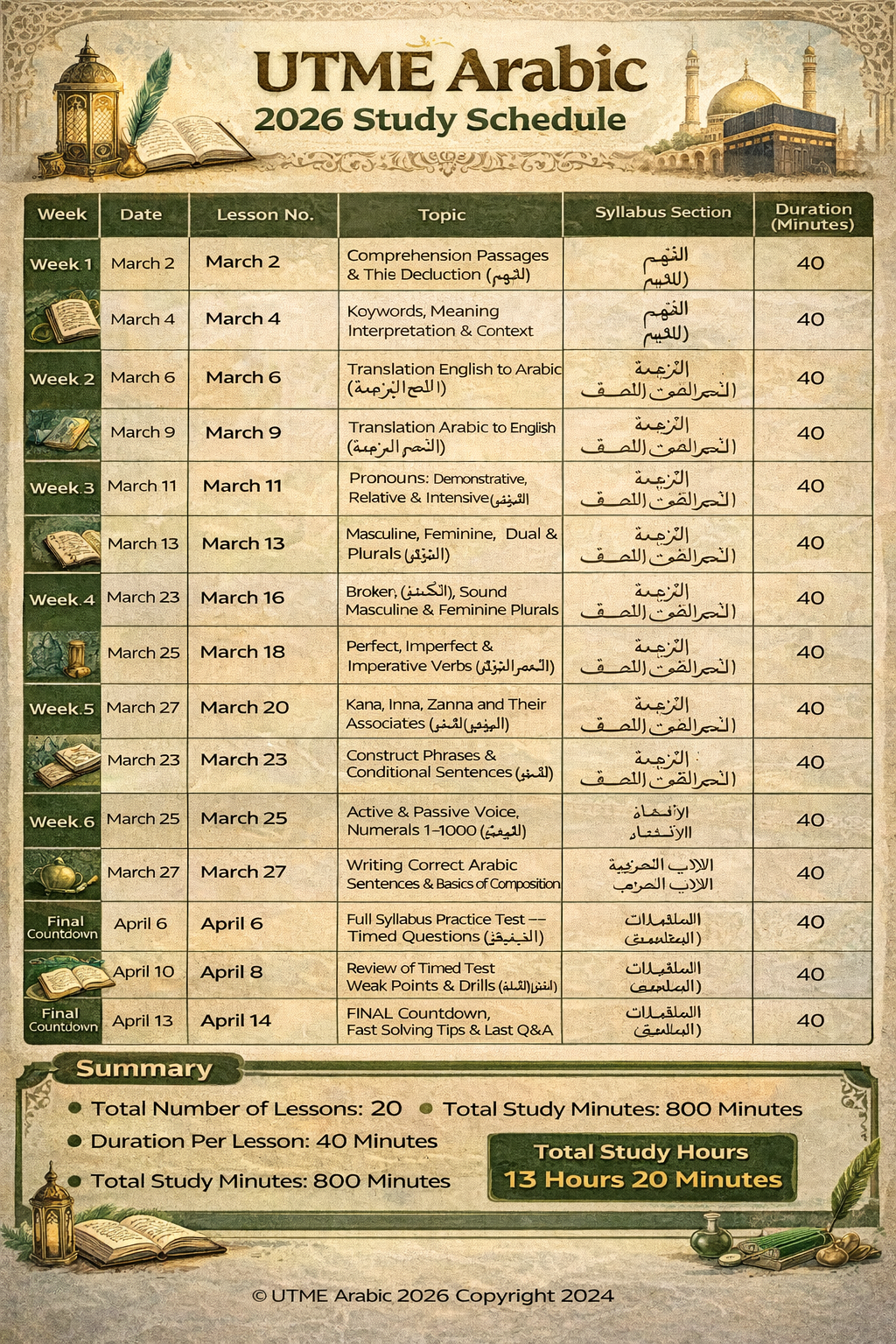 Our 2026 UTME Arabic Preparation Program is a complete, structured, and mastery-driven course designed strictly in line with the official UTME Arabic syllabus .